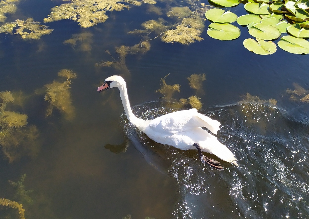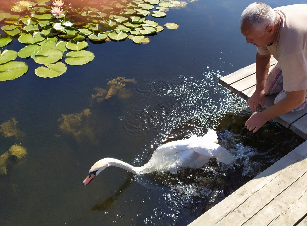 - У нас тут есть пара лебедей, которые каждый год выводят птенцов. В прошлом году мы подобрали два яйца и "подбросили" гусыне. Она их высидела, вылупились птенцы. Подросли, мы их очень хорошо кормили. Они тут были настоящими хозяевами территории, особенно один из них, Борька. Даже поболее этого по размеру был. И сейчас тут семейство одно обитает, так что, лебедю с пляжа будет компания.