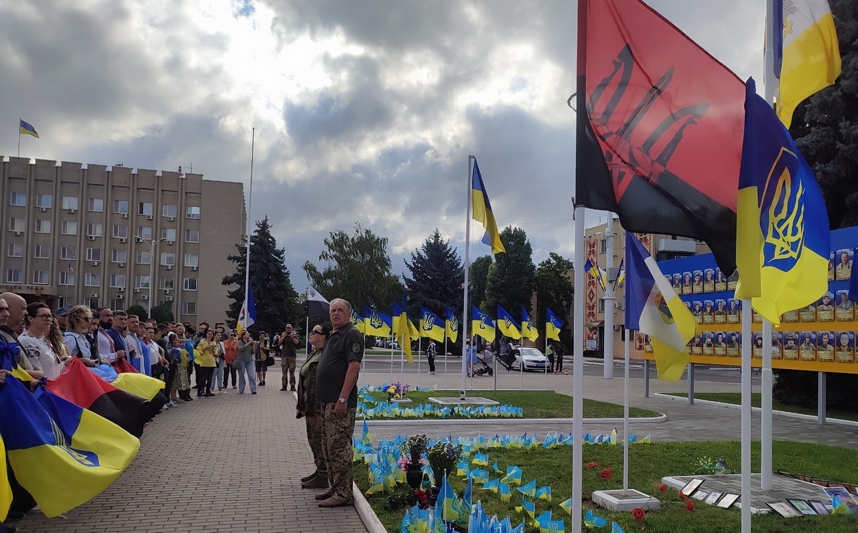 Після звучання Державного гімну України до 20 жовто-блакитних прапорів, що майорять біля меморіалу полеглим воїнам, було встановлено ще два: червоно-чорний (символ національно-визвольної боротьби) та біло-чорний (символ підтримки українських військовополонених і зниклих безвісти).