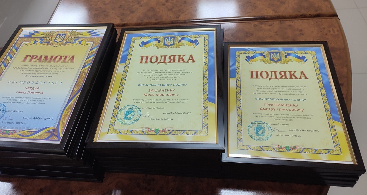 Подяками Ізмаїльського міського голови Андрія Абрамченка нагородили: директора Ізмаїльської гімназії № 2 Тетяну Цибулько, директора Ізмаїльської гімназії № 3 Парасковію Бондаренко, директора Ізмаїльської початкової школи № 4 Ірину Тимофеєнко, директора Ізмаїльської гімназії № 8 Ольгу Осмокеску, директора Ізмаїльської гімназії № 10 Оксану Хмельниченко, директора Ізмаїльської гімназії № 11 Юрія Захарченка, директора Ізмаїльської гімназії № 14 Любов Христєву, директора Ізмаїльського ліцею № 16 Дениса Каражекова, директора Ізмаїльського ліцею «Політехнічний» Ольгу Сіраєву, директора Українського ліцею з поглибленим вивченням іноземних мов імені Т.Г.Шевченка Юрія Головльова.