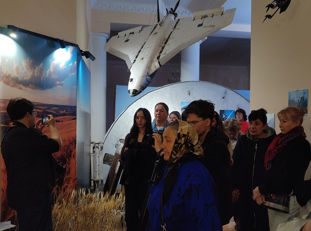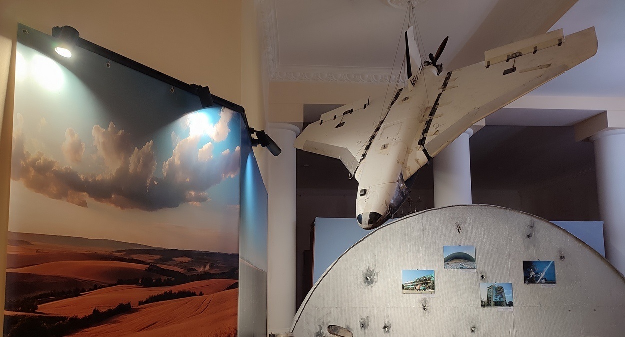 Виставка вражає з першого погляду: під стелею, наче в справжньому небі, нависає ворожий дрон «Гербера».