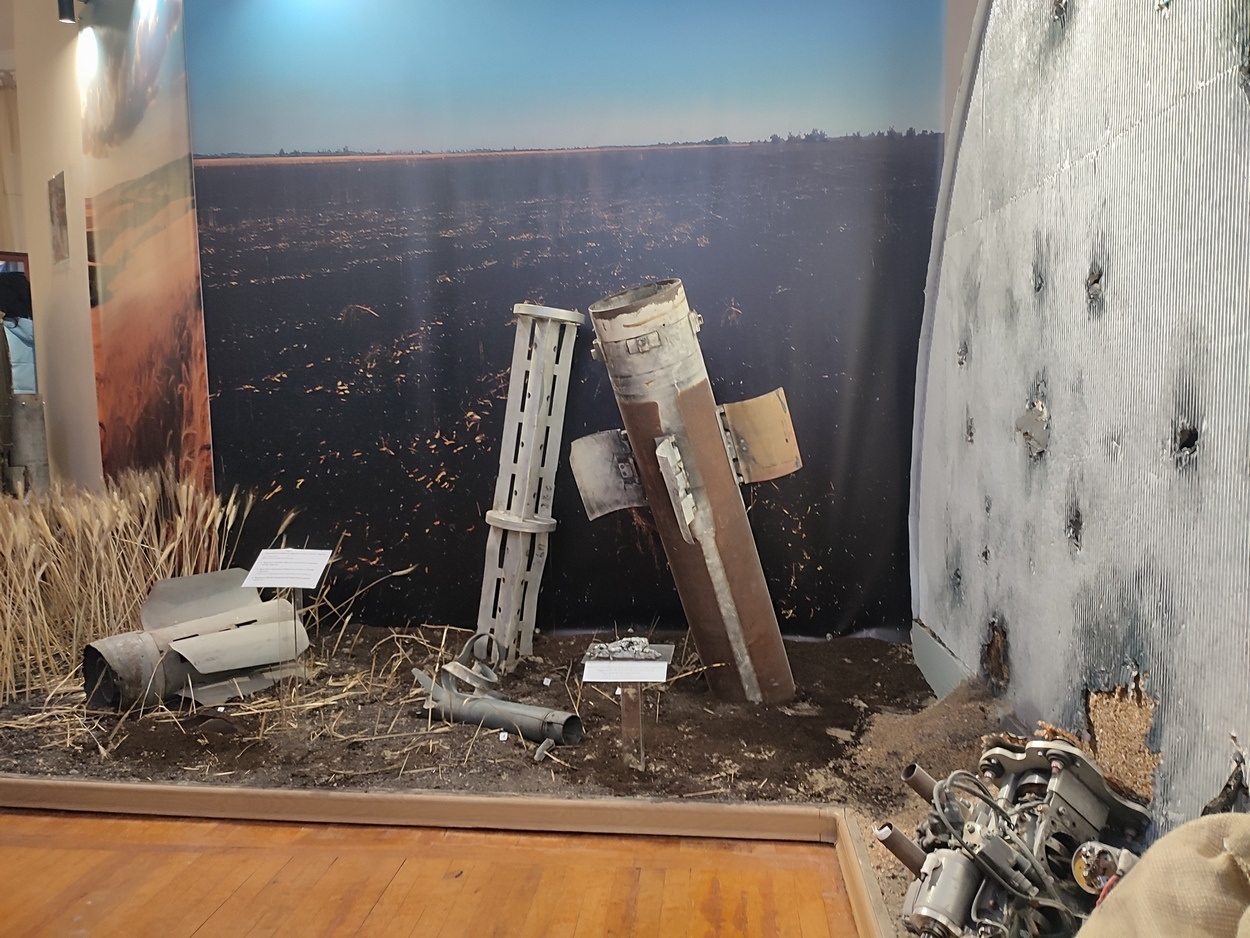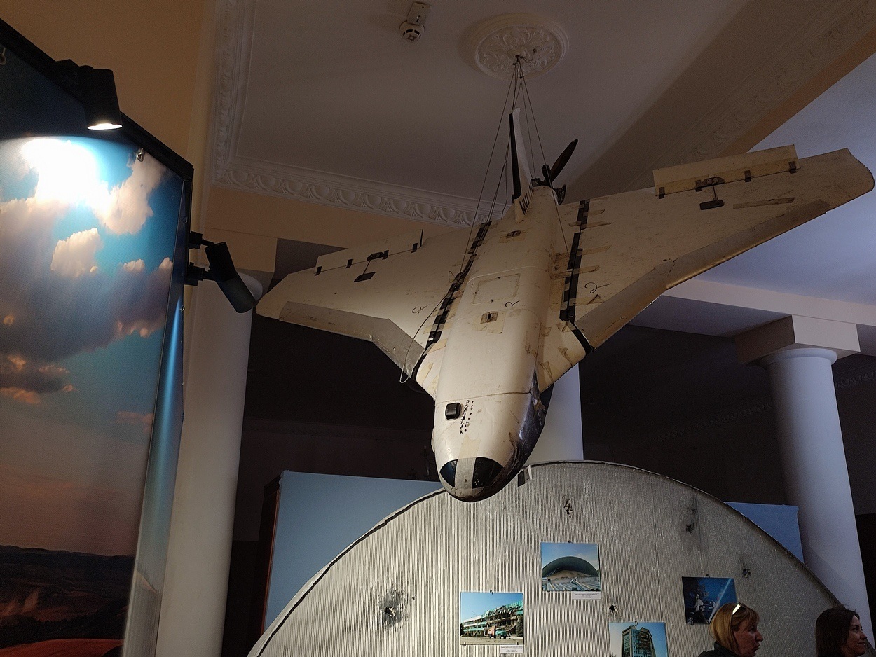 Над цією частиною виставки якраз і нависає справжній ворожий дрон «Гербера», який «посадили» РЕБом наші військові в Сумській області, і передали в музей. Тепер цей трофей – один з експонатів.